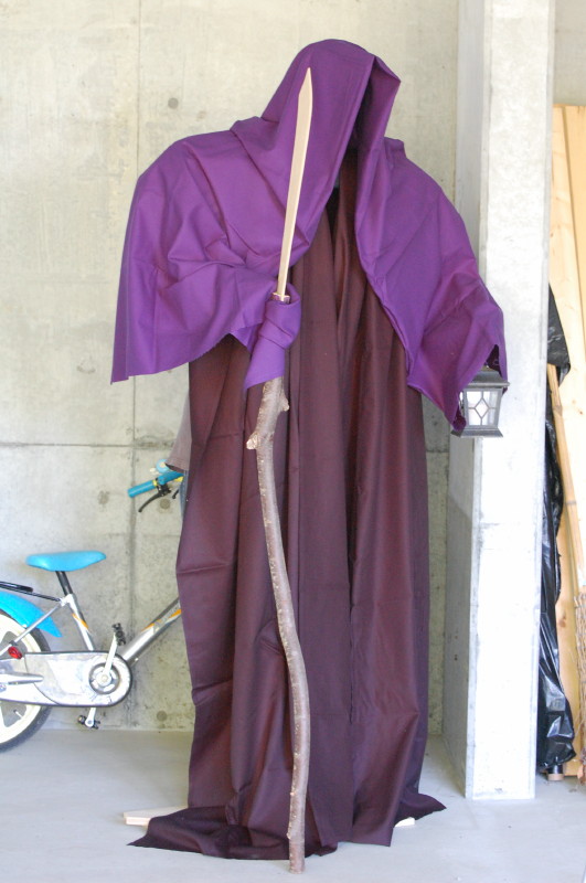 Making a Grim Reaper guard for a haunted house or Grim Reaper Halloween decoration is quick and quite easy. Here is the 6’4″ guard I made with a few pieces of cloth, chicken wire, and some PVC pipes. The project took about 1.5 hour to complete.