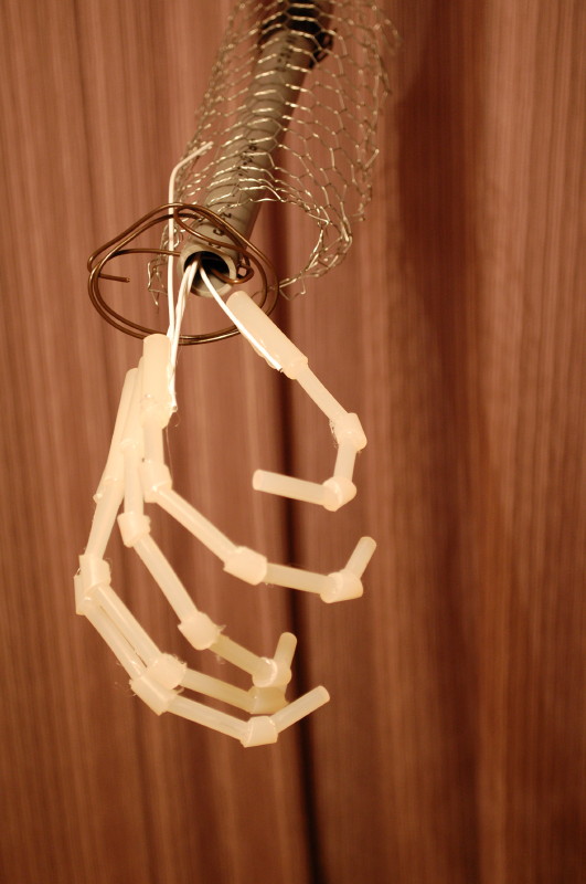 Here’s a close up of the hands for a Grim Reaper prop. I made them using two different sizes of hot-glue sticks. I made individual fingers and then glued them together to a wire base. I threaded the wire base through my PVC pipes to attach them to the Grim Reaper.